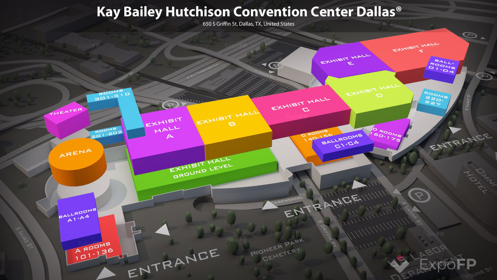 KBHCCD位于达拉斯市中心,一直是达拉斯天际线的固定设施,提供100万平方英尺的展览空间,三个宴会厅,88个会议室,1,750个座位的剧院和一个9,816个座位的竞技场。屡获殊荣的设施通过天桥与1,001间客房相连,毗邻两个Vertiport登陆垫。