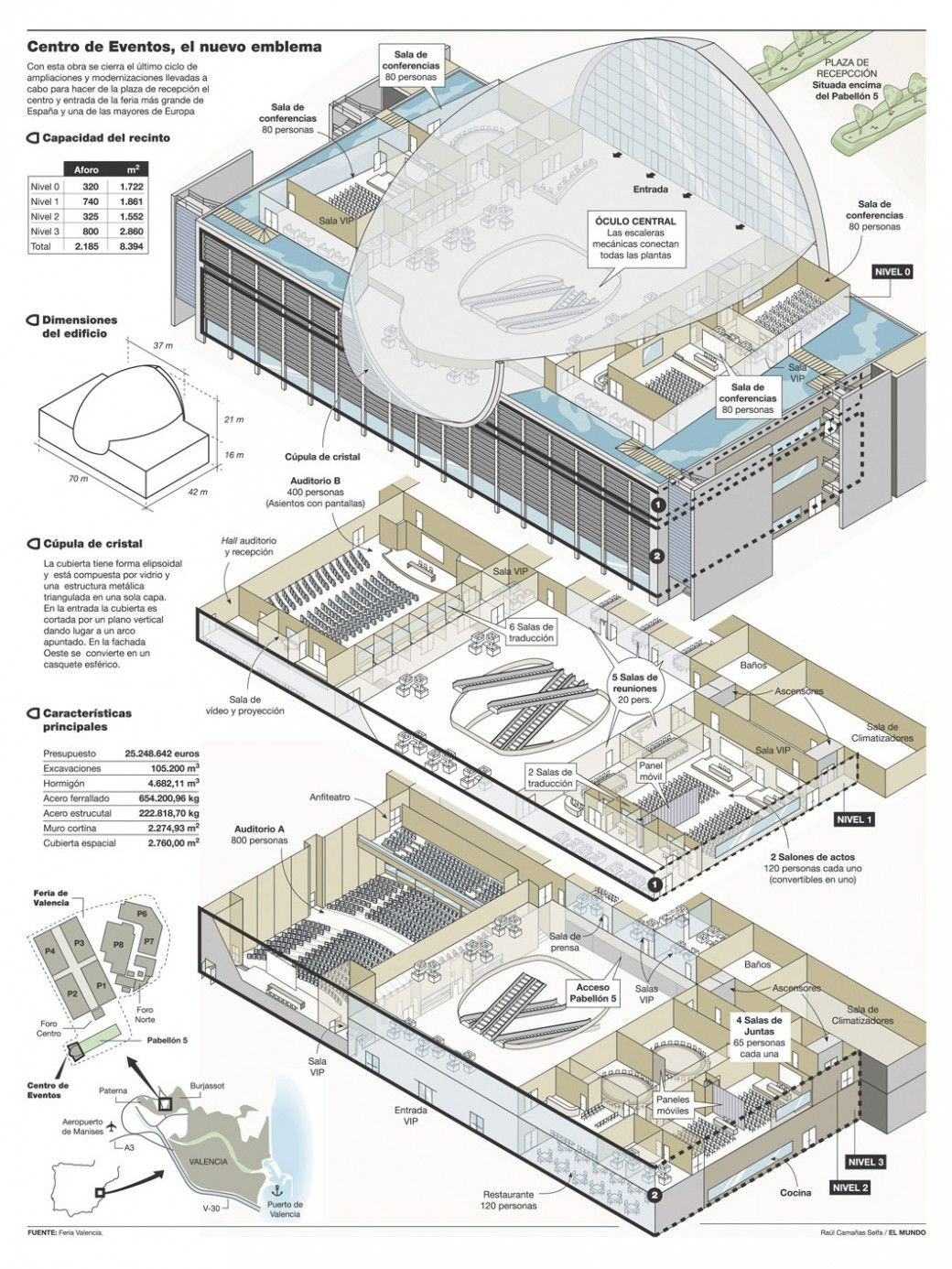 瓦伦西亚会展中心既是西班牙最大的会展中心之一,也是全世界规模最大、最现代化的会展中心之一。建筑面积23万平方米,拥有八个多功能厅、小会议室、大型会议室和6.8万平方米的停车场。 瓦伦西亚会展中心屋顶结构由钢片和钢棒集合安装而成,其中前者作为节点,而后者负责支撑三角形玻璃面板。钢片每个都比前一个的位置稍高,通过其顶点系紧在每个三角形面板上。外层可控制太阳入射情况,确保具有较大的反射率,从而保护内部空间受到过度的光照。建筑物的南北两侧均为通风立面,有助于避免出现冷凝现象。 该建筑的规划功能包括四间会议室,每间都能容纳80人;两个大会议室,每间可容纳120人,还可合并成一个单一的空间,配备动态面板系统;一间容纳400人的礼堂和一间750人的礼堂(包括视听控制和同步翻译室);可容纳65人的会议室;以及新闻办公室、VIP房间、财政部、活动办公室和餐厅,还有五间20人规模的会议室、储藏室和洗手间。