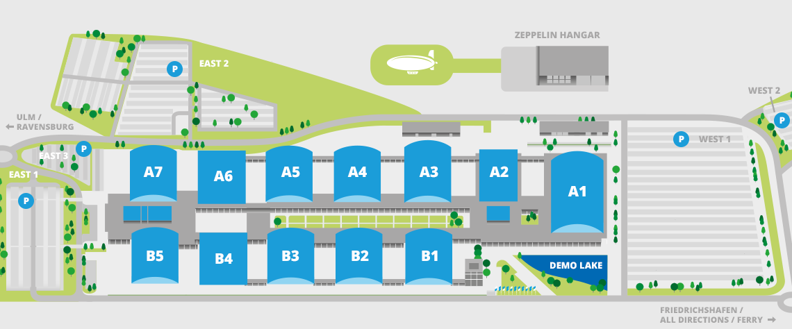 德国腓特烈港会展中心坐落于瑞士和奥地利交界处的腓特烈港市内,中心总展览面积70000平方米,它分了十个展厅。