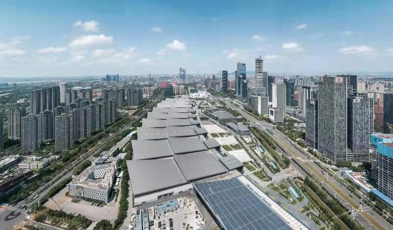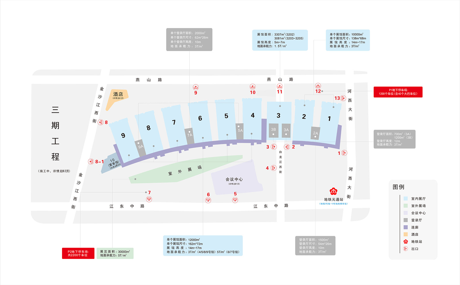 南京国际博览中心建筑面积36万平方米,其中展览面积17万平方米,总国际标准展位6000个,室外展览面积3万平方米,停车位2500个。会议中心包括5000平方米的多功能厅,800人报告厅,20间大小会议室,19间各式餐厅和一幢500间客房的4星级国际酒店。其他配套设施包括240间客房的经济型酒店,8200平方米办公服务设施等。