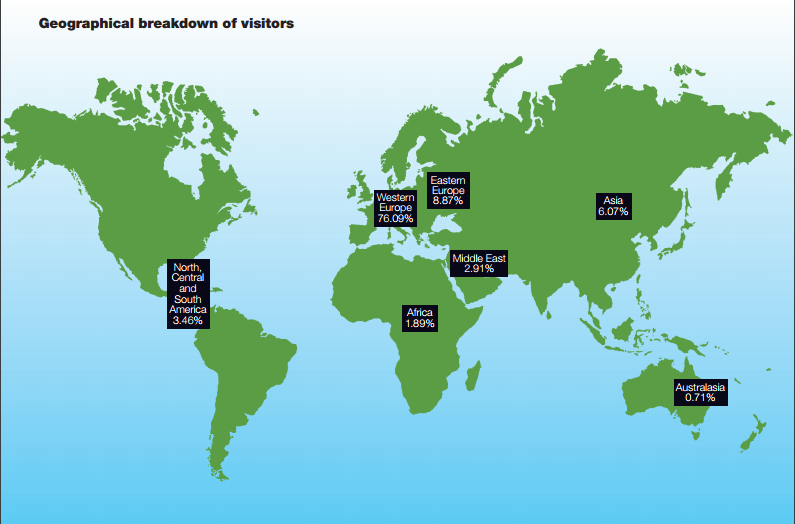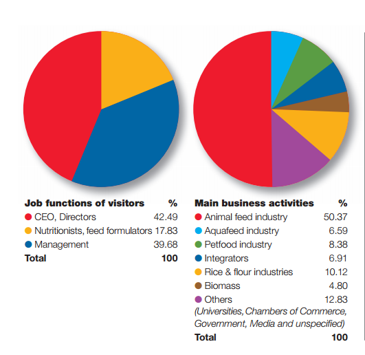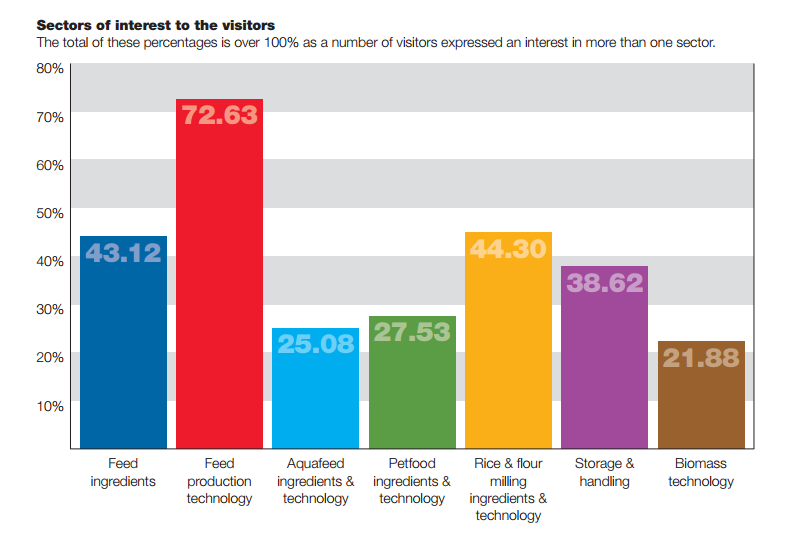 上届德国科隆饲料展览会VICTAM全球共有500多家企业报名参加,涉及德国、土耳其、加拿大、比利时、中国、俄罗斯、印度、澳大利亚、意大利、法国等28个国家和地区,展示的产品主要是以饲料原料(47%)、饲料加工及养殖设备(15%)及兽药和其他相关产品。其中,中国共有45家企业报名参展,为历届最多的一次,大部分企业都是连续参展的展商。GRAPAS活动还展示了一家工厂内的辅助设备,但其主要内容是用于大米和面粉厂的专业系统和技术,以及用于粮食储存,保存和运输的其他展品。