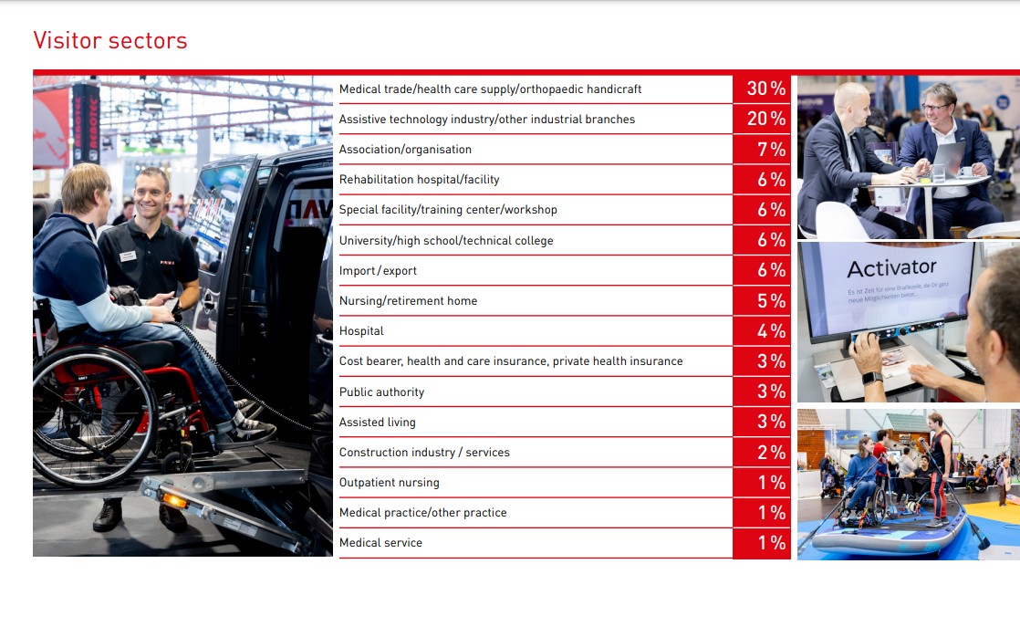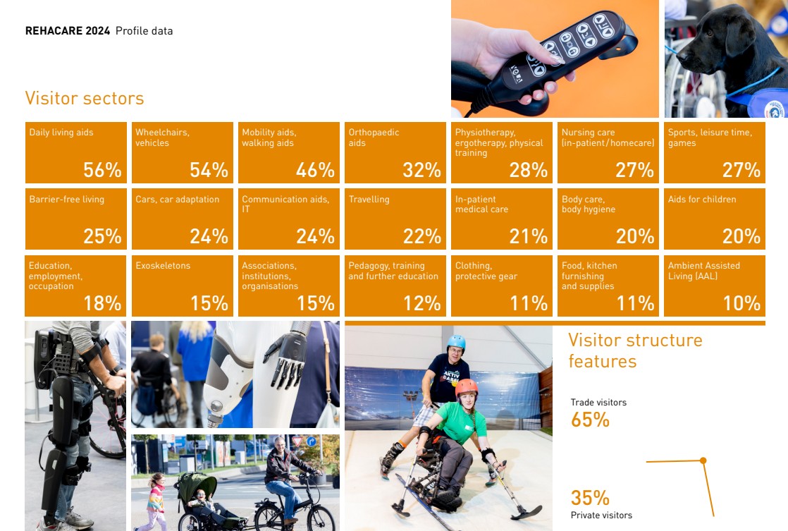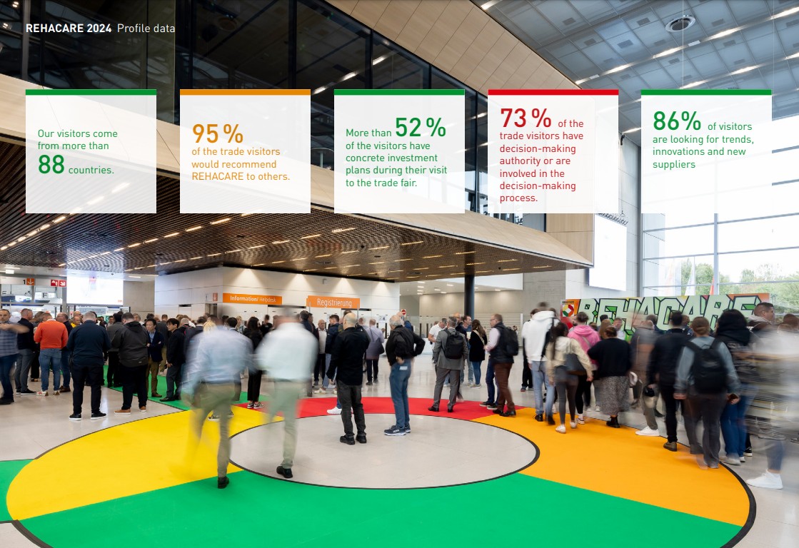 REHACARE展示了最新的残疾人用品和康复设备,包括轮椅、助行设备、假肢、假眼、助听器、辅助通讯设备、居家辅助设备等。参展商和观众来自世界各地,是一个展示最新技术和行业趋势、交流和合作的重要平台。