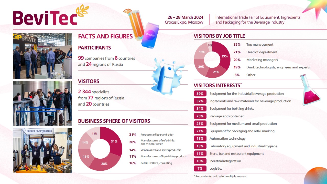在BeviTec展会上有来自世界各地的参展商将展示啤酒、葡萄酒、软饮料、果汁、饮用乳制品、矿泉水、功能饮料、烈酒和软饮料的生产和装瓶设备、原材料和包装。莫斯科Bevitek展会的独特之处在于它涵盖了饮料行业的整个技术链。广泛的商务活动包括酿酒活动、会议和酿酒大师班。