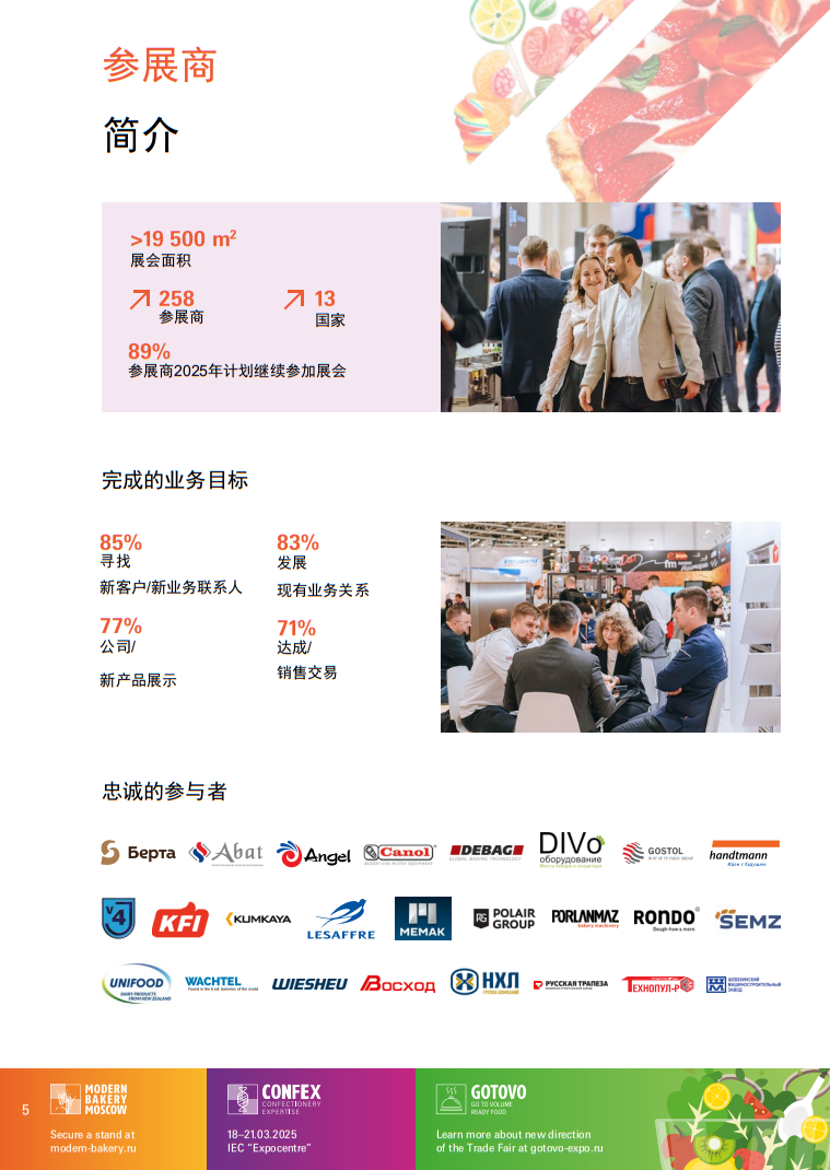 参展商在Modern Bakery Moscow展览会上展示各种糖果、巧克力、糕点、面包以及与烘焙和甜品制作相关的设备和材料。他们通过展示各种口味、创意和品牌的产品,与潜在客户建立联系,并与同行业专业人士进行商务洽谈。